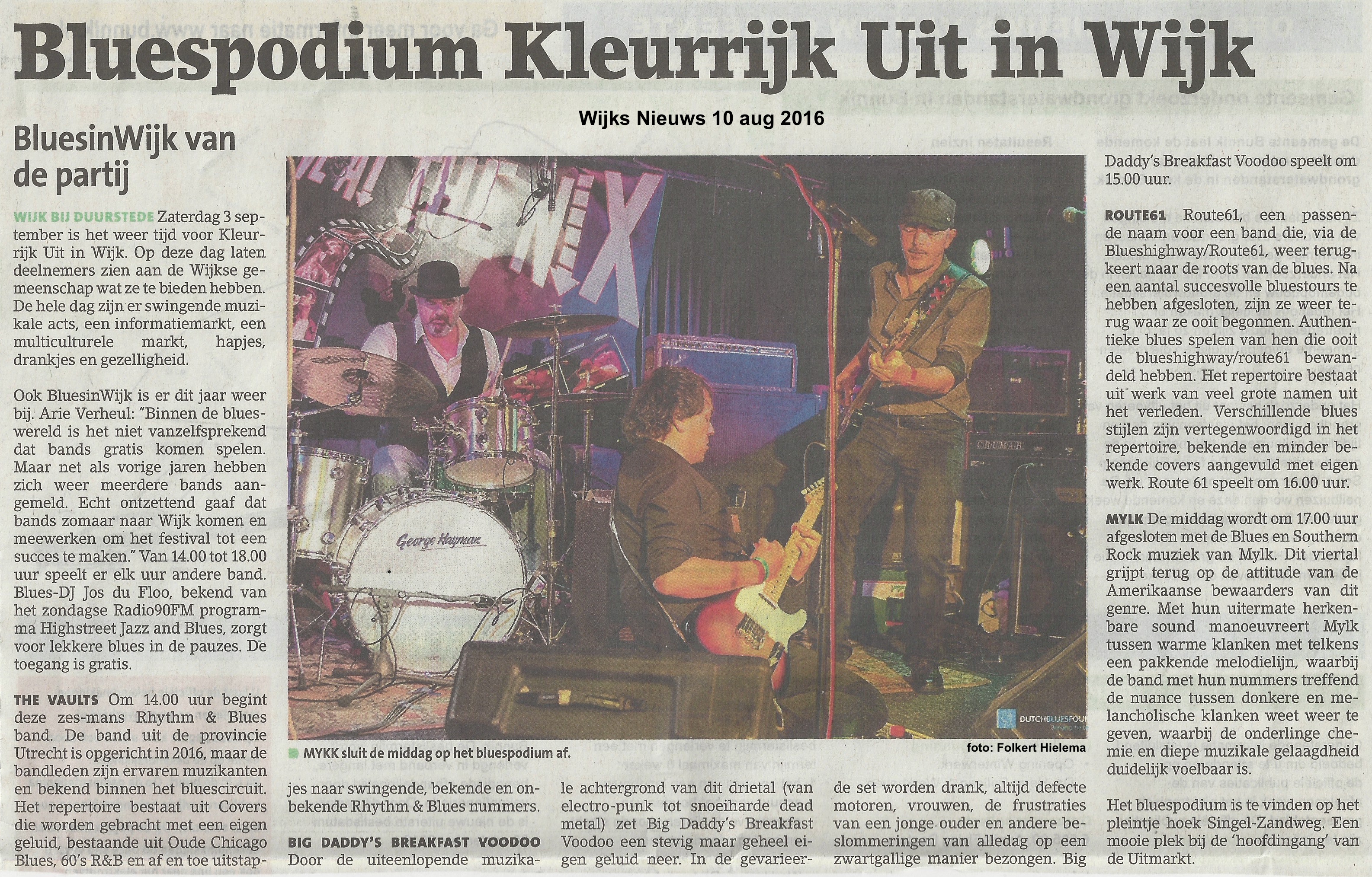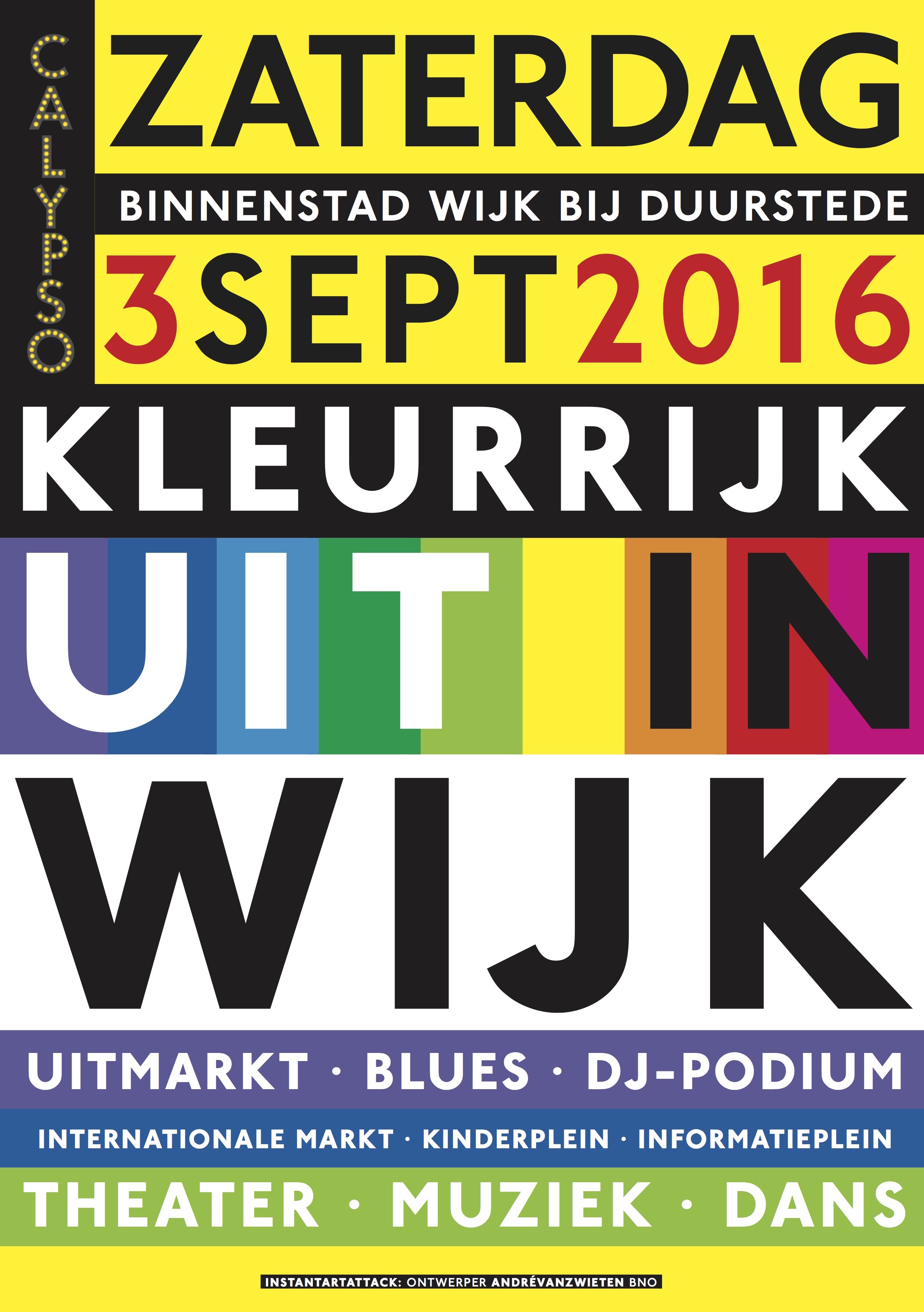 Zaterdag 3 september weer KLEURRIJK UIT in WIJK, een prachtig jaarlijks terugkerend feest in de Wijkse binnenstad. Ook dit jaar een spetterend festival met de hele dag swingende muzikale acts, een informatiemarkt, een multiculturele markt, heerlijke hapjes en drankjes en bovenal veel gezelligheid. Natuurlijk is BluesinWijk ook weer van de partij, net als vorig jaar met een bluespodium bij café de Veldpoort. Gratis toegang.