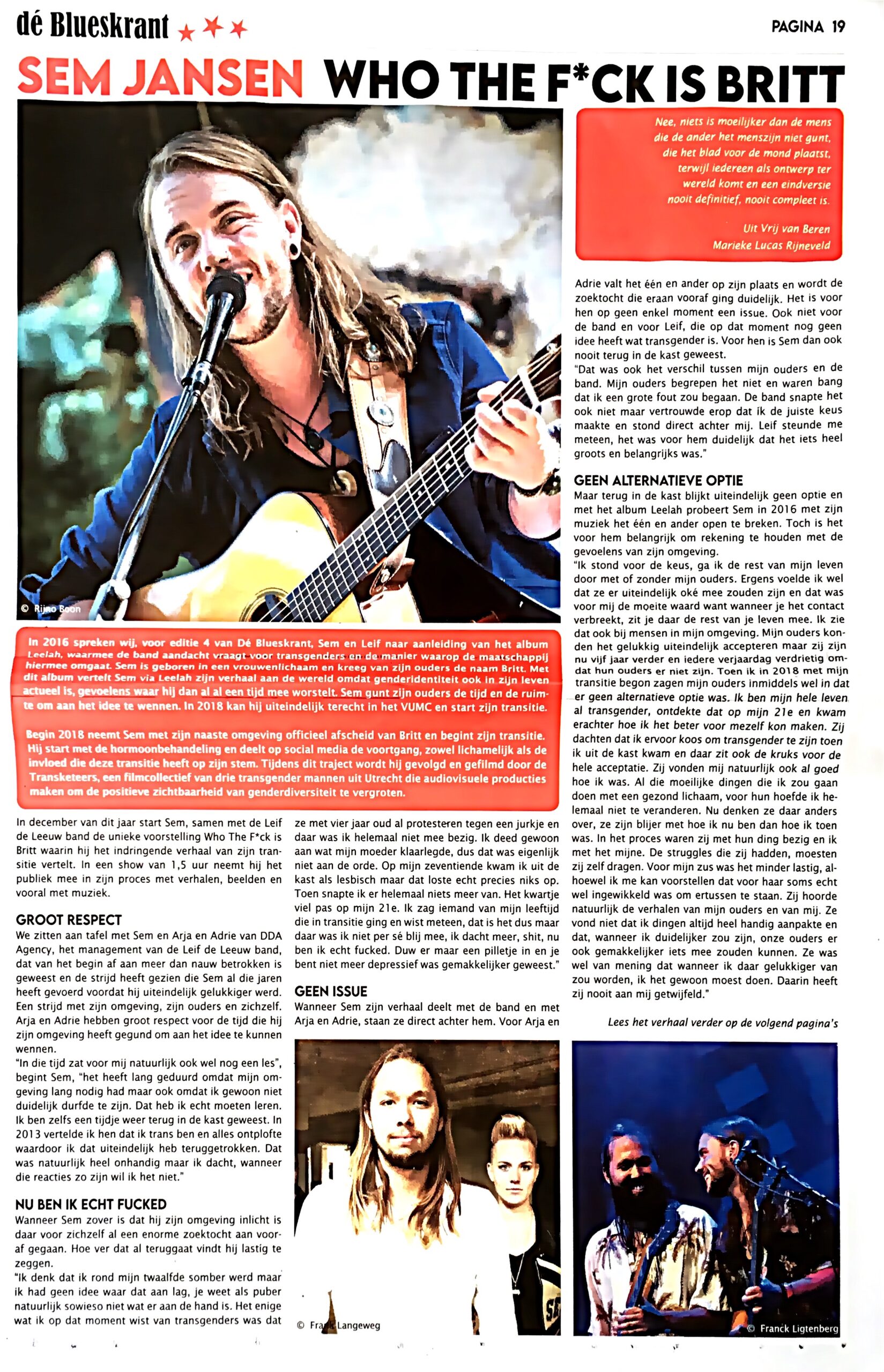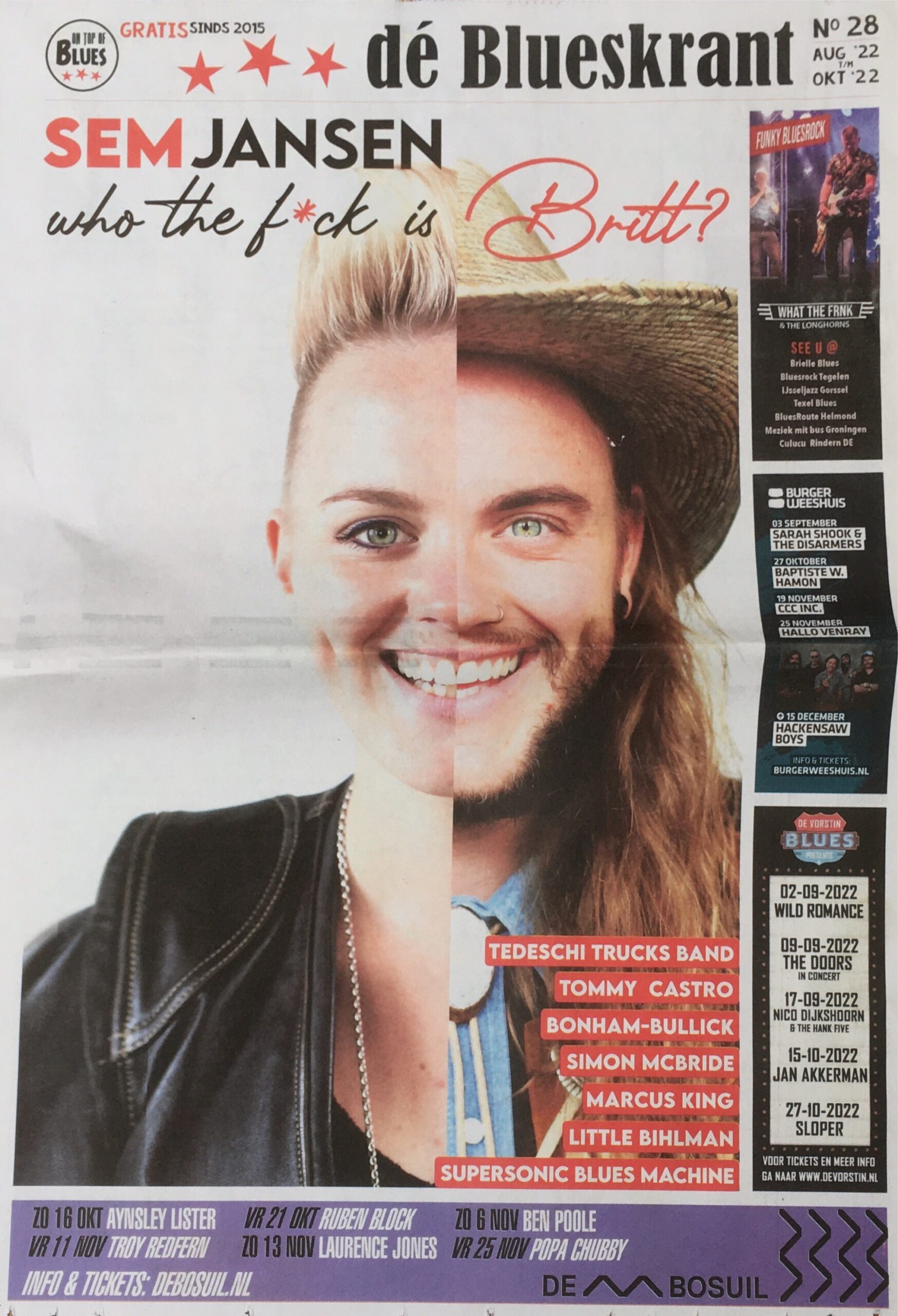 Op zondagmiddag 19 maart 2023 organiseert BluesinWijk in theater Calypso de unieke voorstelling “Who the f*ck is Britt”? met Sem Jansen en de Leif de Leeuw Band. Een show van 1,5 uur waarin het publiek op indringende wijze wordt meegenomen in het proces van Sem’s transitie van vrouw naar man.