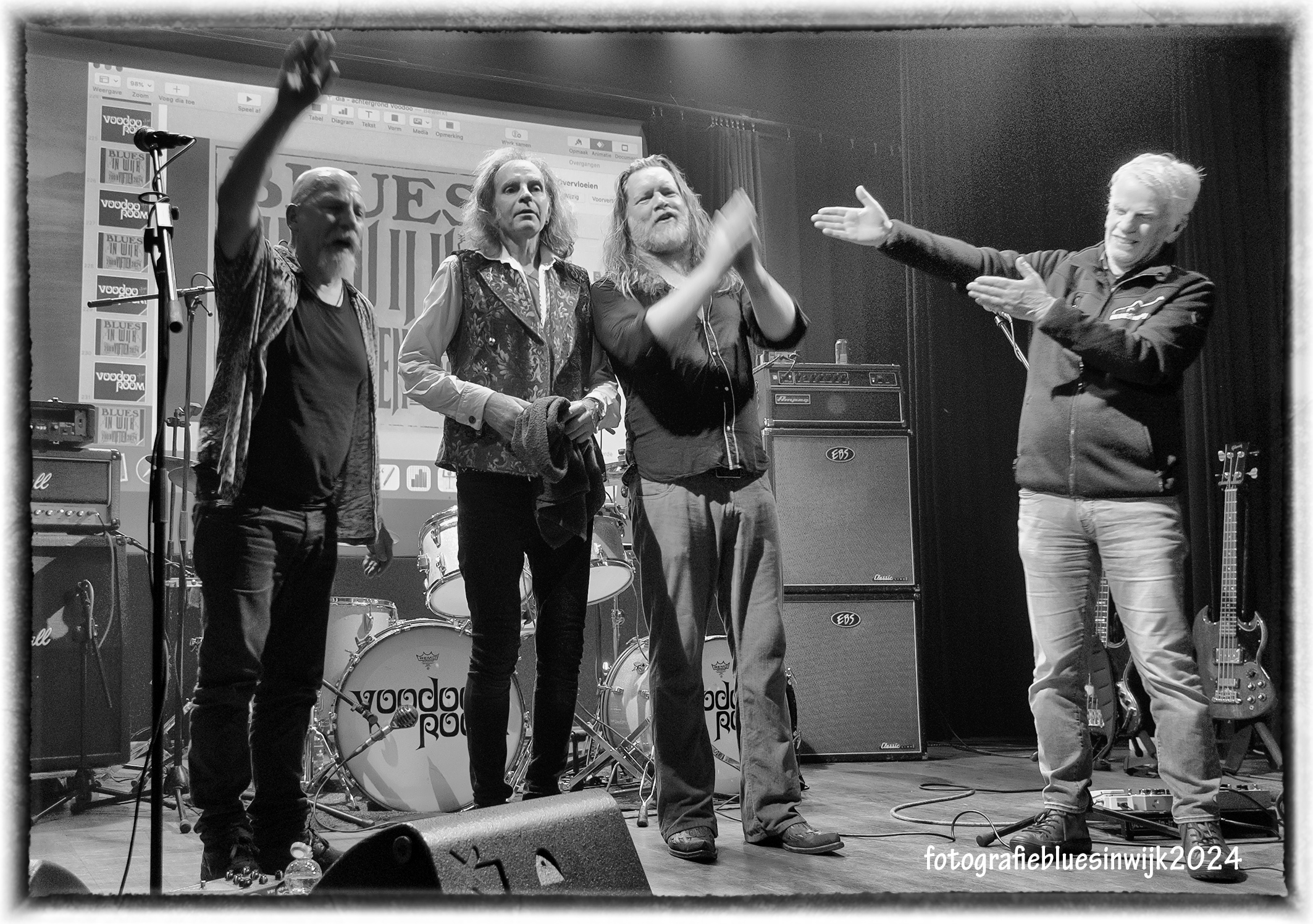 Leen Wander, onze ‘cineast’ van dienst omschreef het als volgt:”Het was weer een lekkere muziekavond in theater Calypso. De muziek kennen we allemaal maar de muzikanten zijn nieuw in Nederland. Volgens eigen zeggen is dit pas hun vierde optreden in ons kikkerlandje. Je kan er van vinden wat je wilt maar coverbands zijn erg in trek anno 2024. En als je dan zo goed voor de dag komt als dit Voodoo Room trio dan kan je er donder op zeggen dat we deze drie mannen vaker gaan zien, ook op de festivals. Over het repertoire bestaat geen misverstand. Het staat met chocoladeletters op de posters: Hendrix, Clapton en Cream! Dat is dan ook gelijk de reden voor het uitverkochte huis. 17,5 eurootjes voor een hele avond muziek die er toe doet, dat laten we niet voorbij gaan. Dan maar geen Linda de Mol, wie is de Mol of andere gemol… Vette muziek! Daar komen we voor! Op het podium staan drie ras muzikanten die stuk voor stuk met veel grote namen hebben samengespeeld. En dat is te zien en te horen ook. De band heeft weliswaar een frontman zanger/gitarist maar in feite zijn ze alle drie frontman. Inclusief de drummer die vaak meezingt en tussen de nummers door de praatjes maakt. De heren zijn erg goed op elkaar ingespeeld. Nergens een setlist te bekennen, ze kijken elkaar aan en ze weten het. Over hun muzikale prestaties kunnen we kort zijn, dat is dik in orde, heel dik in orde. Een goede zanger en fantastische gitarist, een hele strakke drummer die al na e e n nummer het zweet op zijn hoofd had staan en een zeer gedreven bassist die speelde als een zeventien jarige die net de avond daarvoor een hagelnieuwe bas voor zijn verjaardag had gekregen. Er waren momenten dat je met je ogen dicht de late great Jack Bruce voor je zag. Heerlijk om dit allemaal te aanschouwen. Het publiek was trouwens sowieso erg enthousiast. Zelfs het onvermijdelijke geklep viel reuze mee. Misschien kan er wel wat minder Hendrix in. Het is vloeken in de kerk maar laten we welzijn, de goede man wordt werkelijk altijd en overal gespeeld. Alle respect voor de beste gitarist ooit maar op een keer ben je het toch een beetje zat. Maar ja, uitverkocht he…..never change a winning team zeggen ze dan. Na afloop bij de t-shirts verkoop veel gezelligheid. Niks sterallures, gewoon een stel Britse kerels met in de hand een kouwe klets, cheers VooDoo Room, tot de volgende keer”.